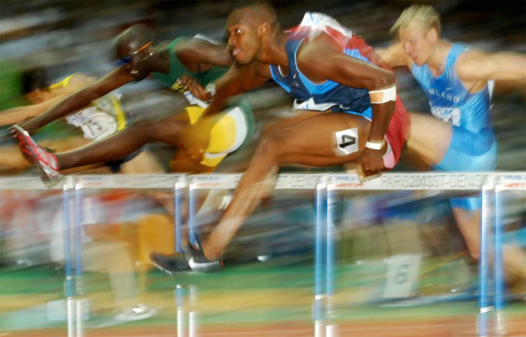 Larry Wade during a men’s 110-meter hurdle race at the 2003 world championships in Paris. Credit…Mike Hewitt/Getty Images