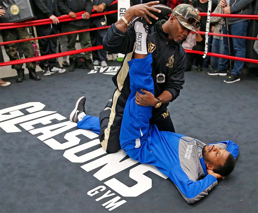Coach Larry Wade, left, and Badou Jack, right doing some drills during a media workout. Credit…Louis Grasse/PxImages/Icon Sportswire, via Getty Images